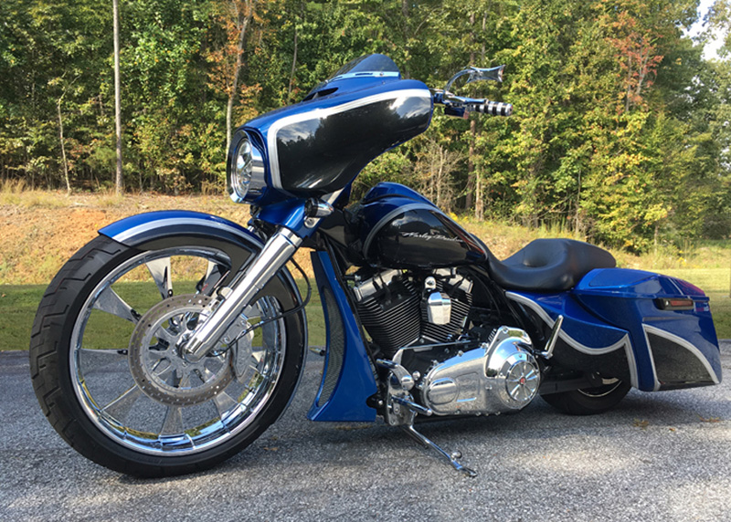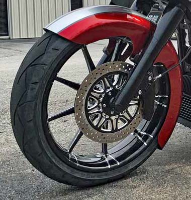 HHI also delivers a complete selection of HHI Renegade Custom Wheel designs in the New 21 & 23 x 5.5 sizes with either dual or single brake hub installed along with your choice of 180mm tires mounted and balanced. In addition, HHI offers several brake upgrade packages including our 4-piston direct bolt on calipers or the industry leading 6 piston caliper for 13- inch rotor single disc package in chrome, black or blaze red finishes.