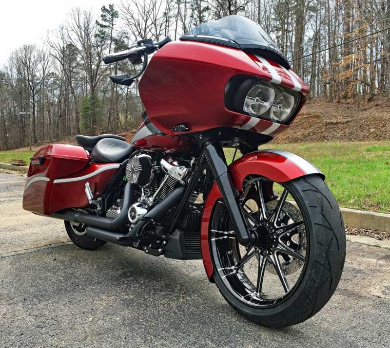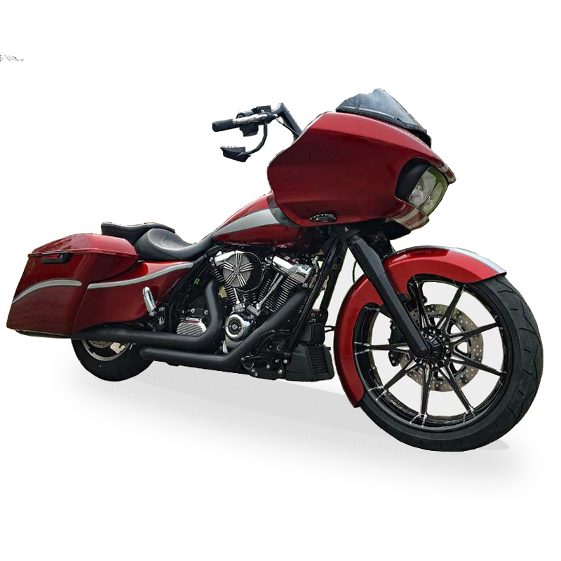 As part of the kit options and a requirement for the install, we have included our time proven X-23 and X-26 Bolt-on triple tree and neck rake kits to complete the installation package. The 21 x 5.5 wheel requires a triple tree rake equivalent to what would typically be used on the traditional 23 x 3.75 wheel, hence the use of our X-23 triple tree package. Likewise, the 23 x 5.5 wheel requires the same neck rake modification as a 26-inch wheel. HHI offers multiple solutions for this application with the X-26 being the simplest for install. Contact us direct to discuss all the possibilities we can provide in full custom bagger Wide Tire builds.