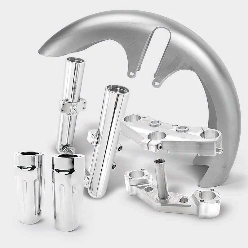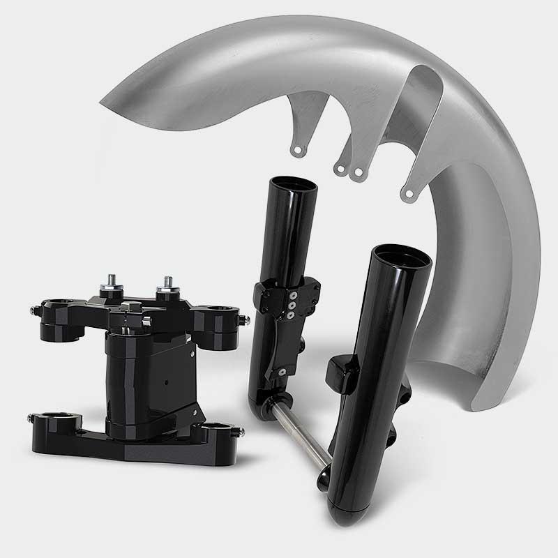 The HHI Wide Tire Kit includes custom HHI billet lower legs featuring a hidden axle and tapered axle spacers, custom extended length billet taper cut fork covers, a choice of three steel fenders and all mounting hardware. These kits can be ordered for dual or single sided brake calipers and in black, chrome or raw finish for the custom builder who has a color theme to match.