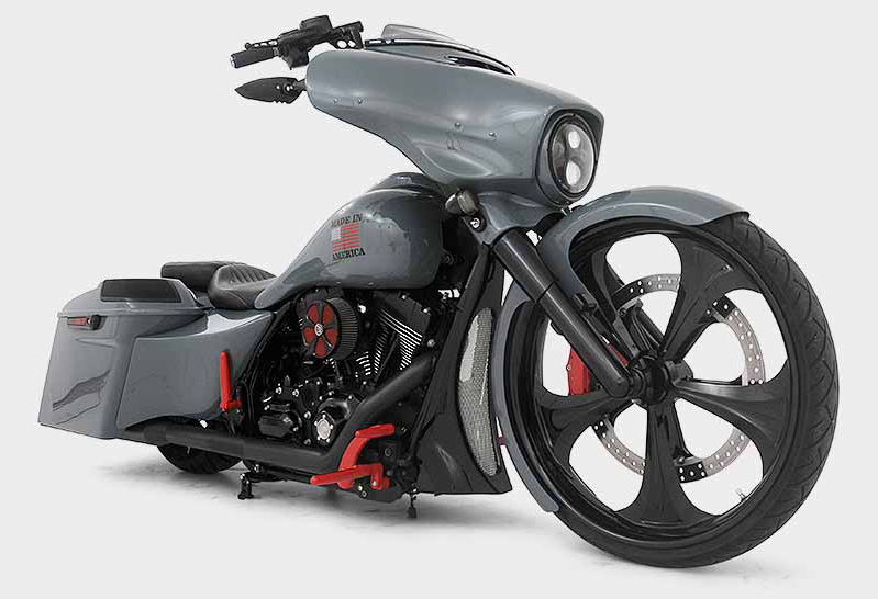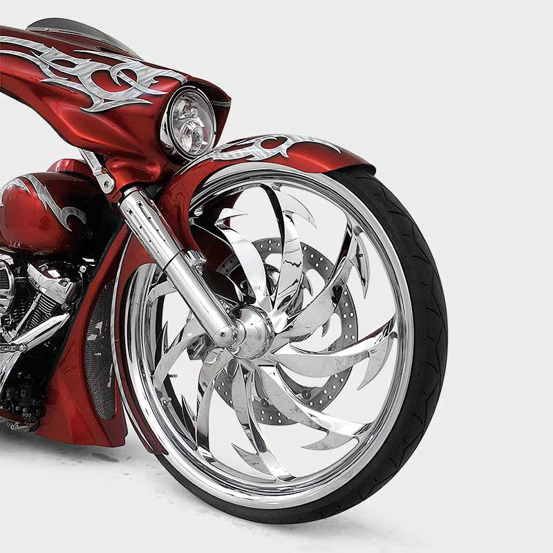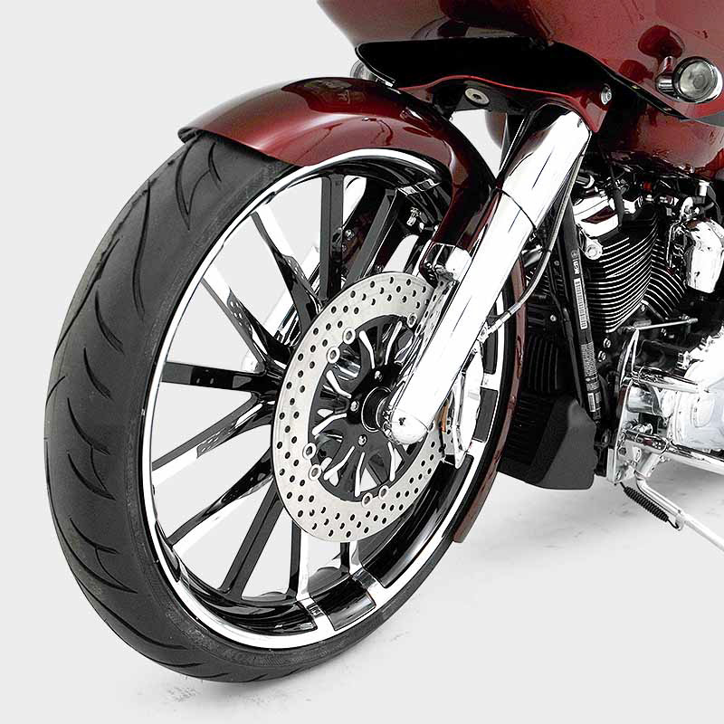The HHI Billet Touring Fork Leg Conversion Kit with Bomber end capfits 2014-23 and new style 2024-up FLH models. This kit features a hidden axle, contoured axle spacers and a custom fender mount with adjustable height for 21 inch wheel fitment. Also features a 4 bolt fender mounting system for custom fenders providing maximum strength and fender rigidity. The Fork Leg Conversion kit comes in Black or Chrome Finish and single or dual disc caliper mounts. HHI Billet lower leg kits are interchangeable with stock Harley Davidson internal components or most upgraded suspension parts.