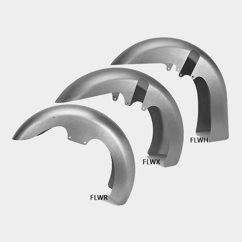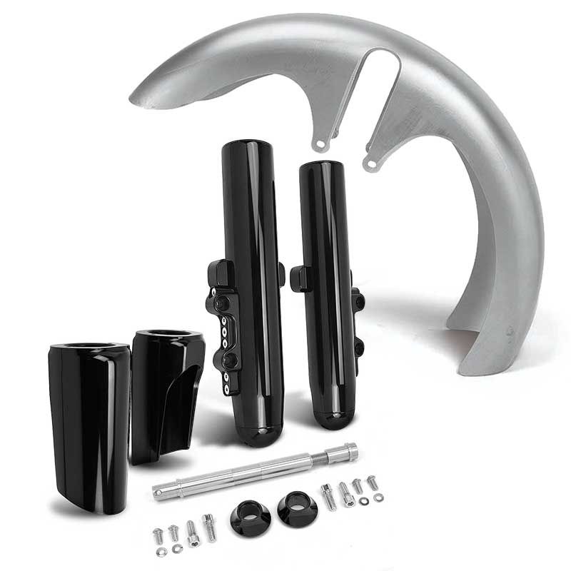 The HHI Wide Tire Kit includes custom HHI billet lower legs featuring a hidden axle and tapered axle spacers, custom billet taper cut fork covers, a choice of three steel fenders and all mounting hardware. These kits can be ordered for dual or single sided brake calipers and in black, chrome or raw finish for the custom builder who has a color theme to match.