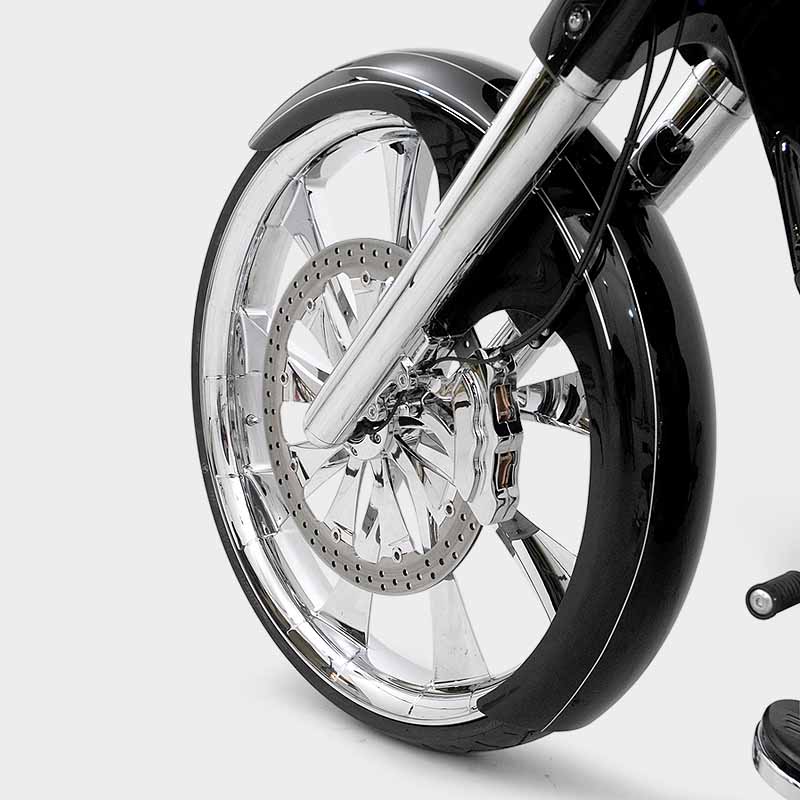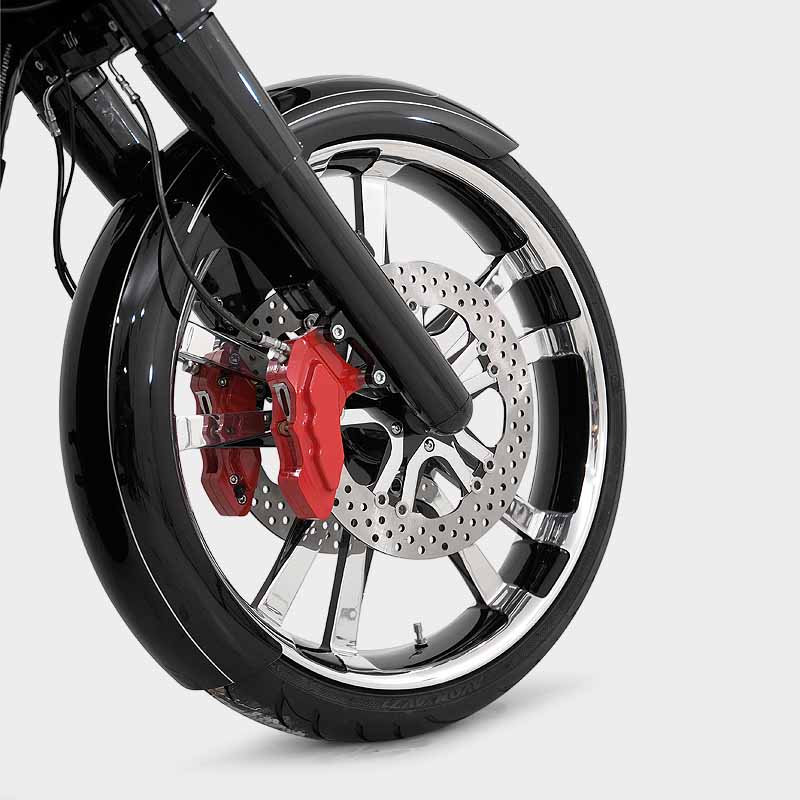 This exciting, new 6 piston differential bore caliper for 18 inch diameter rotors is the first direct bolt on, purpose built caliper for the Big Wheel Bagger market. The BFC-18 caliper features a completely redesigned and upgraded 6 piston configuration with bigger bores and larger brake pads which deliver increased overall braking performance.