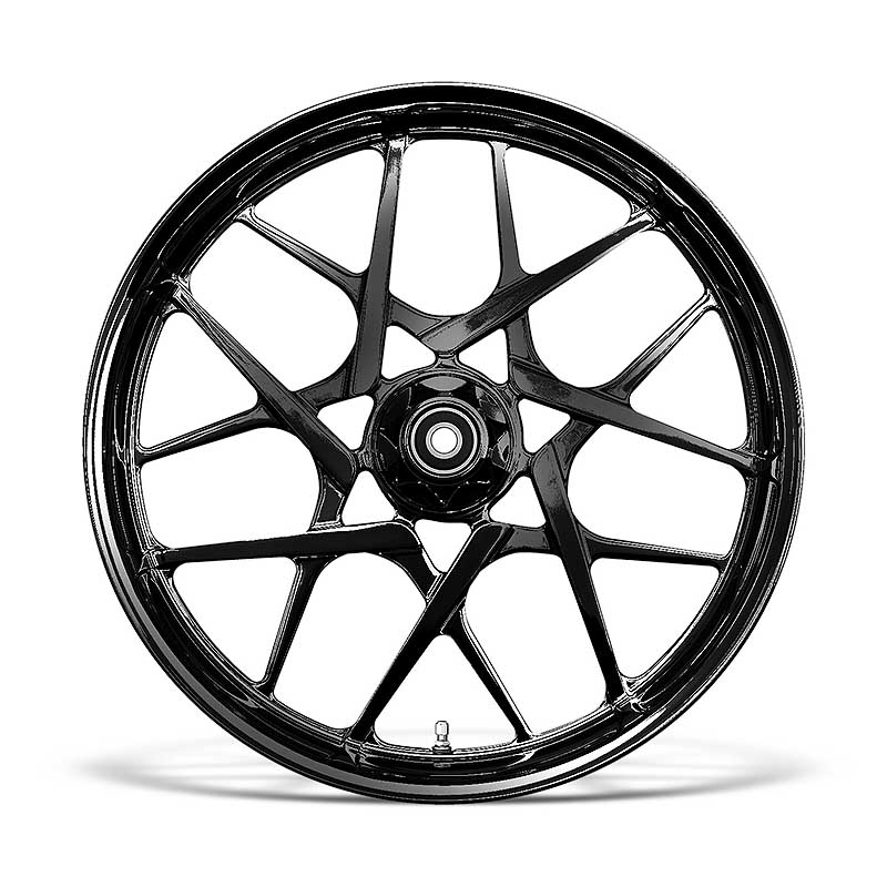 The Bridgeport will enhance the look of your bike like nothing else! This intentionally geometric 14-spoke wheel looks fantastic with its angular 3D machined spokes and extensive machining on the rim. The Bridgeport Wheel is a robust spoke design which sets a dramatic look on any touring bike or custom build alike. The Bridgeport is available in sizes 16" to 32" and that includes the latest 18, 21 & 23 x 5.5 Wide Tire Front Wheels. The Bridgeport has matching true floating brake rotors in 11.5,11.8, 13 & 18-inch sizes and matching air filters, pulleys and sprockets are available