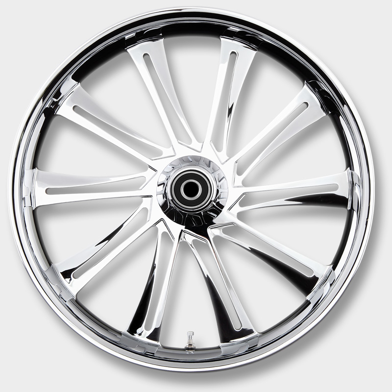 Renegade’s visionary Winslow is a striking addition to their cutting edge wheels. This 10-spoke wheel provides an imposing visual affect to any chopper or Bagger without the “gaudy” overkill. The slender spoke pattern provides a significant weight reduction and less rotating mass, direct bolt on, matching air cleaner, rotors and pulley are available. Please allow 4-6 weeks for delivery of wheel orders or call for availability before ordering.