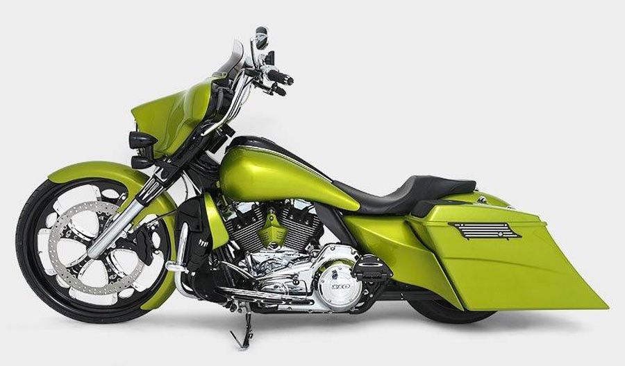 Build #37 Customer Bike GREEN BITCH. Daytona Build. HHI 14" Street Glide Handlebars. HHI Neck Rake Kit. 26" Rapture Phantom Cut Wheel. HHI 18" Matching Rapture Brake Rotor and 6 piston HHI brake caliper. HHI Bomber Lower Legs. HHI Braided Brake lines, FLR Fender and fender spacers. Custom Paul Yaffee Tank. Topshop Black Death Bag & Side Cover Kit. Air FX complete suspension Kit.