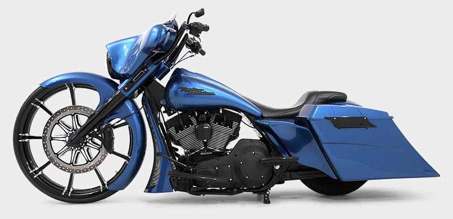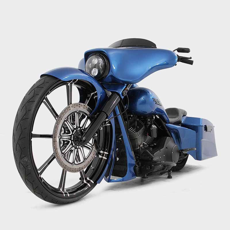 Build #48 2005 Street Glide, HHI 14" SG Reaper Bars, HHI 9 degree Short Neck Builders Kit 12 degree Trees, HHI Torpedo Lower Legs, 30" Renegade Racine Wheel, 18" Renegade Racine Rotor & HHI Caliper, HHI 30" Wrap Fender