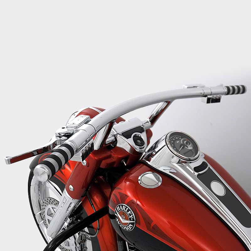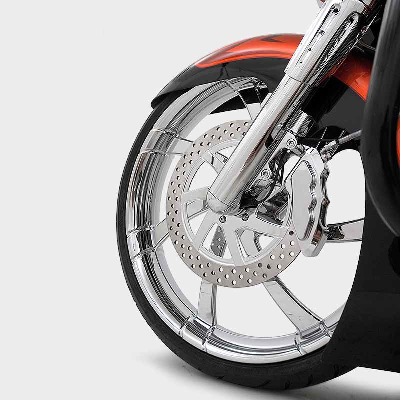 Build #54 14 Road King, HHI Bomber Lower Legs, HHI Billet Tapered Fluted Fork Covers with Holes, 23" Renegade Instigator Front Wheel & Matching 13" Rotor. HHI 6 Piston Caliper, Freedom True Dual Right Side Under Exhaust