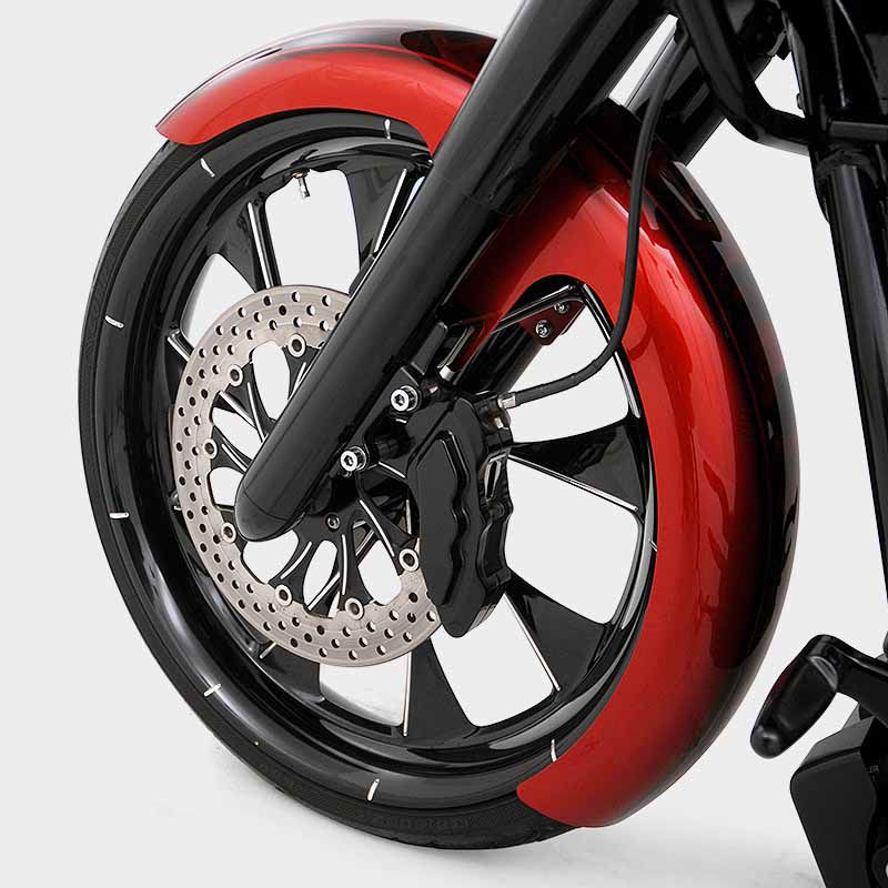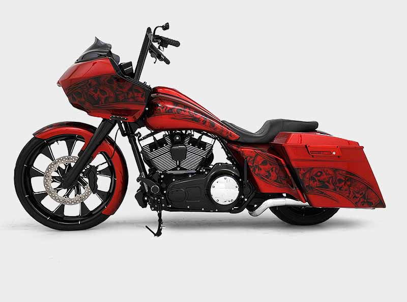 Build #56 2013 Road Glide, HHI Bomber Lower Legs, HHI Forward Control, HHI 14" RG Reaper Internally Wired Handlebar System, Renegade 23" front Phantom Cut Whistler Wheel & Matching 13" Rotor, rear wheel 17"x6.25" with 200mm tire ,Freedom True Dual Right Side Under Exhaust, Thundermax ECM, 107" Motorbuild, port and polished heads, S&S Gear drive cam, Baddad 4 1/2" stretched bags with speaker lids, Upgrade stereo, Yaffe steel gas tank and flared side covers, Yaffe rear fender. Hogtunes upgraded stereo system.
