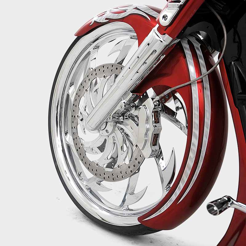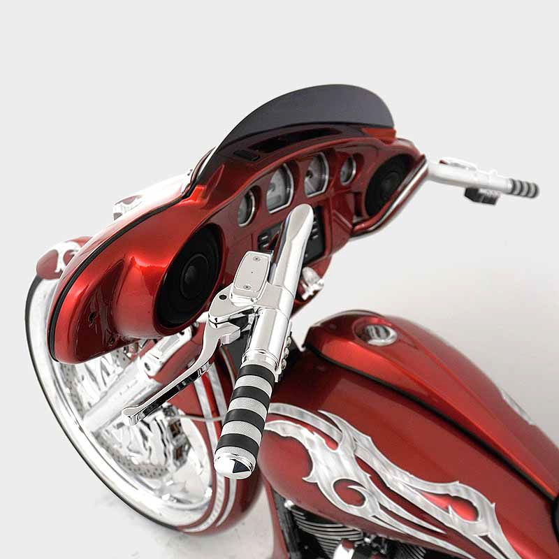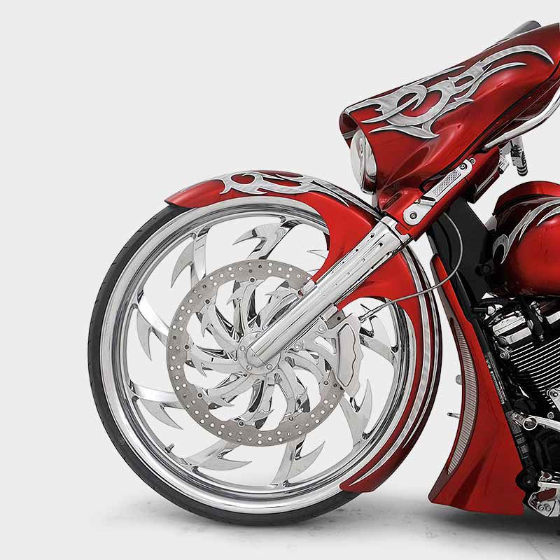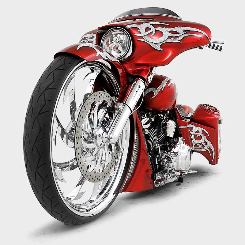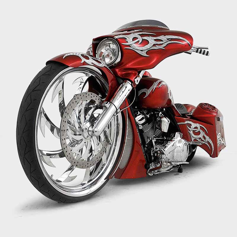 Build #58 17 Street Glide, HHI Short Neck 9-12, 30" Builders Kit. HHI Bomber Lower Legs, HHI Steel Wrap Fender, HHI Billet Tapered Fluted with Accents Fork Covers, 12" HHI SG Reaper Internally Wired Handlebar System, HHI Slotted Forward Controls. HHI 6 Piston Caliper, Renegade 30" Chrome Spearfish Wheel & Matching 18" Rotor, Freedom Performance 2 into 1 Turnout Exhaust.