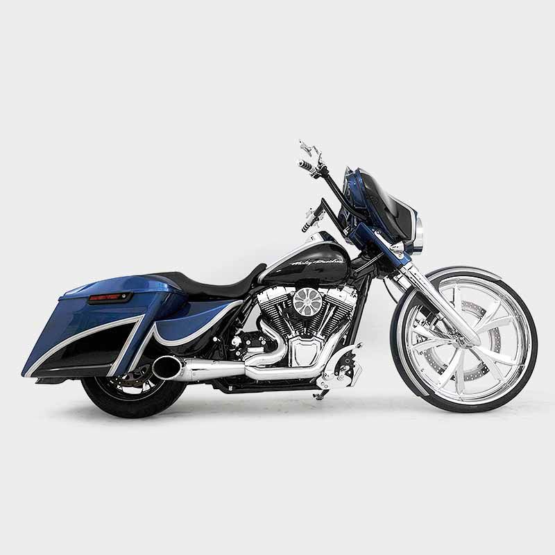 Build #60 2016 Street Glide Special, HHI X26 Bolt-On Rake Kit, HHI Torpedo Lower Legs, HHI Billet Tapered Fluted Fork Covers with Holes, HHI Forward Controls, HHI 14" SG Reaper Internally Wired Handlebars, HHI 26" Steel Wrap Fender, HHI 26" Chrome Spartan Wheel & Matching 18" Rotor, 16x5 chrome rear wheel, AirFX Air Ride front and Rear Suspension. Freedom Performance 2 into 1 Turnout Exhaust, Thundermax ECM, Topshop Viper extended bags, fender and side covers. Baddad speaker lids, Hogtunes upgraded stereo system.