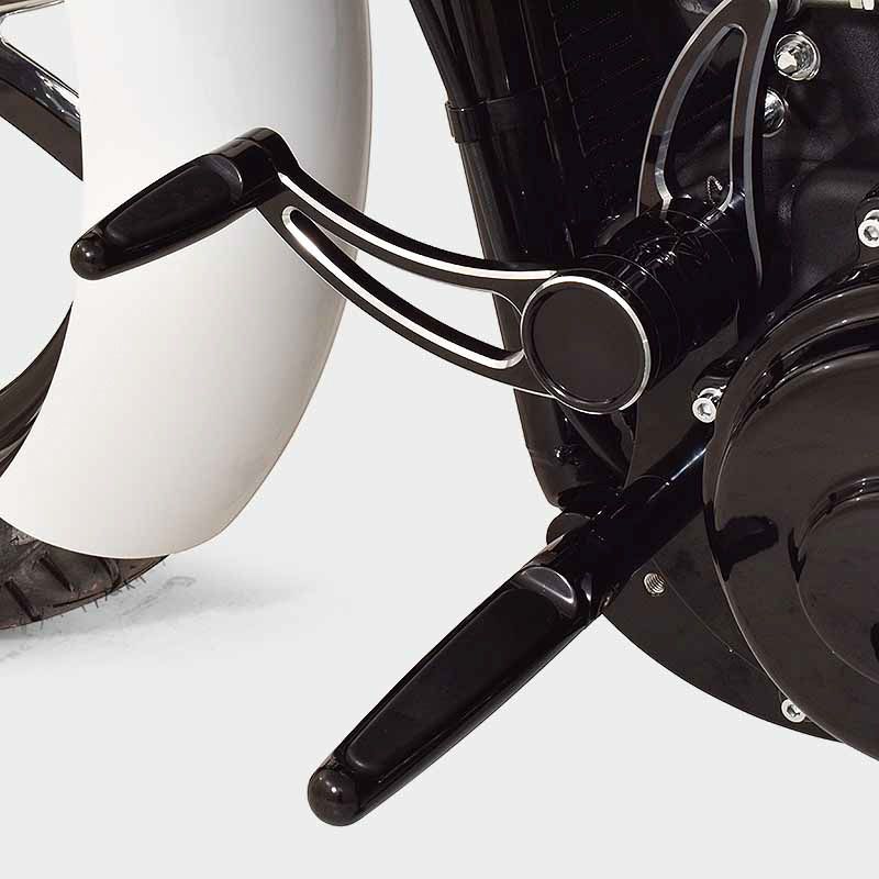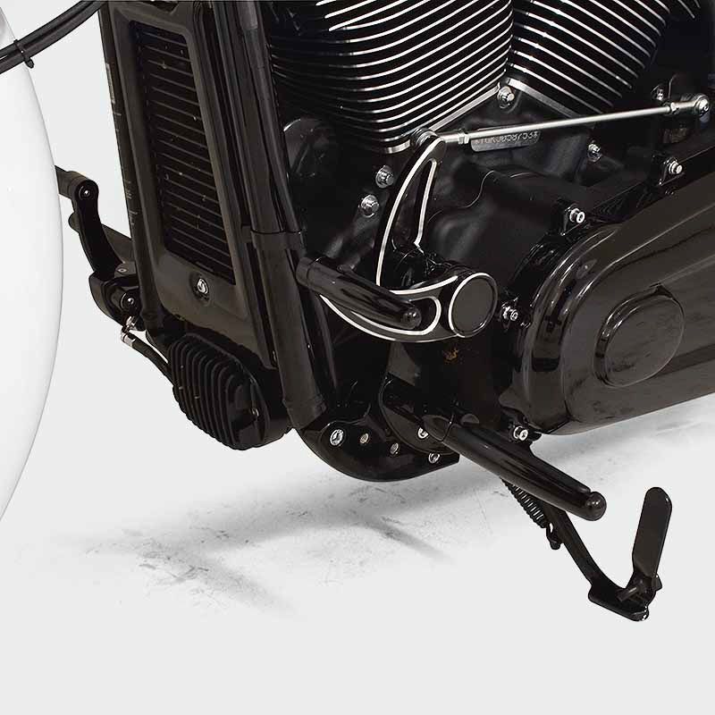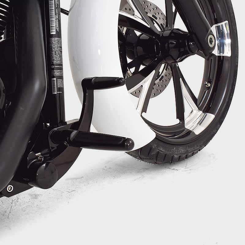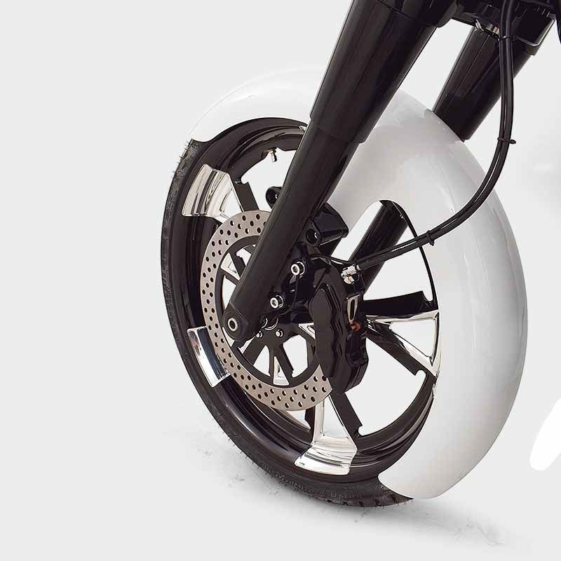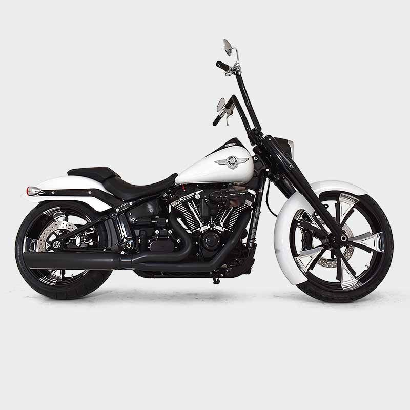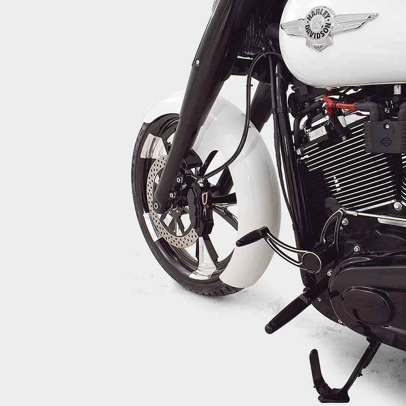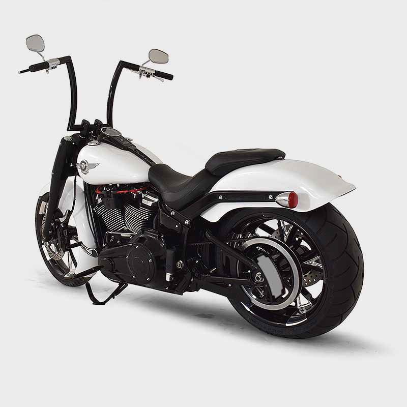 Build #61 2018 Fatboy, HHI 23" Spartan Phantom Cut Front Wheel and 18x8.5 rear wheel with matching 13" front rotor and 11.5” rear rotor, Metzeler 130-23” front & 260-18 rear tire. HHI 23" Wrap Fender, HHI 6 piston Front Caliper, HHI Softail Forward Controls. HHI 4 degree Raked Triple Tree, 14" HHI Raider Internally wired Handlebar System.