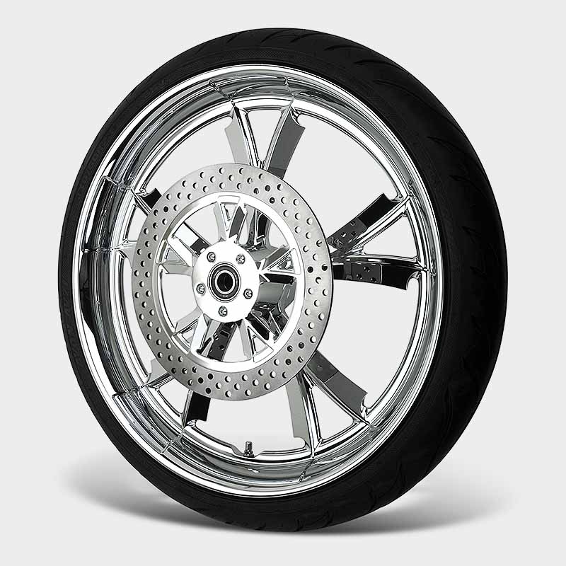 Delivered in a full range of sizes from 16 to 32 inches this wheel is available in Chrome and Black. Matching brake rotors in 11.5, 11.8, 13, ,& 18 complete the package.