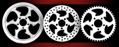 The sculptured windswept 6-spoke design of the Venice delivers an amazing impact on just about any bike, stock or custom alike. With one or two matching rotors attached this wheel makes a statement. Direct bolt-on,  with matching air cleaner, sprocket and pulley available.