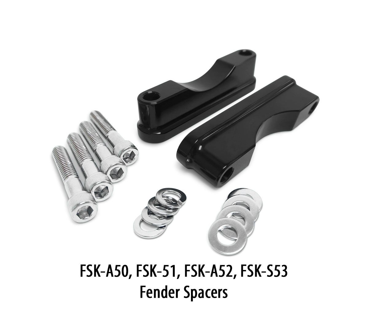 HHI billet fender spacers are available for our 18" through 30" wrap fenders. Spacers are available for both HHI Billet Torpedo and Bomber Lower Legs, Stock FL applications, and FX softail applications.