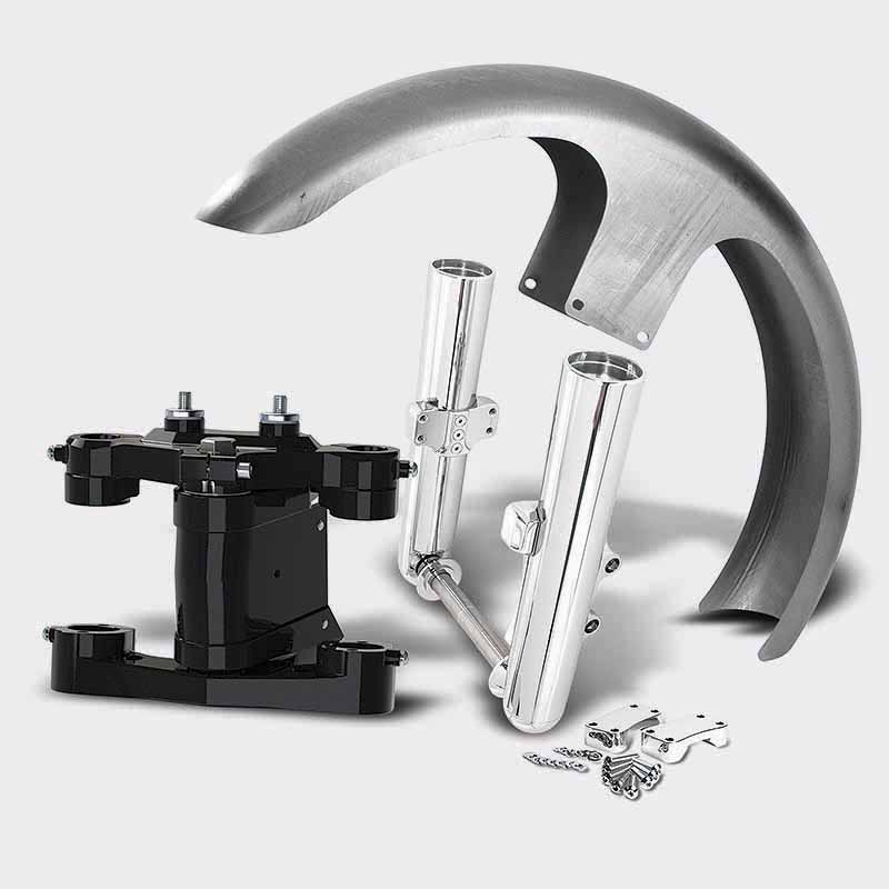 The X 26 Builders Kit includes X-26 ® Bolt-On Neck Rake Kit, slim wrap steel fender or stock style FL fender, & fender spacers, and HHI lower legs, available in chrome or black finish.