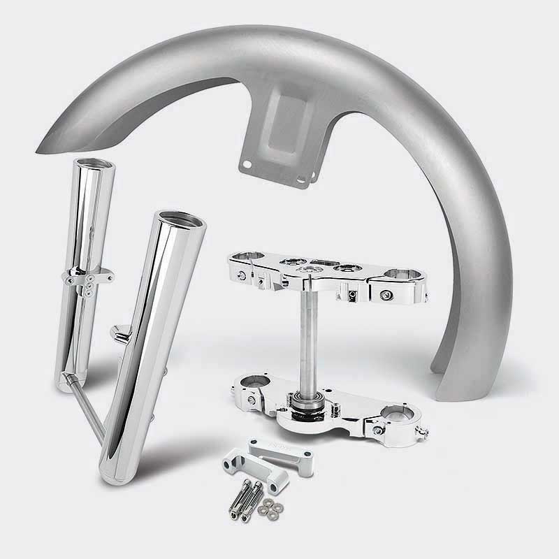 FL Softail Builders Front Kit for 21", 23" and 26" wheels. Fits all 2017-earlier FL Softail Models. This kit comes with fender, fender spacers, triple tree, and HHI billet lower fork legs.