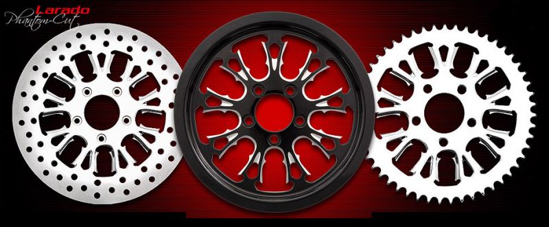 Available in 16" to 32”- inch diameters, with matching Floating Brake Rotors in 11.5,11.8,13 and 18-inch sizes, with a matching Pulley or Sprocket. Phantom Cut wheels are now available in Black, Aztec Red, Inca Gold, and Cobalt Blue