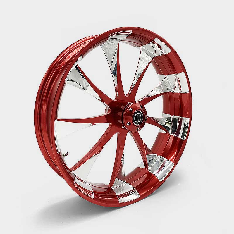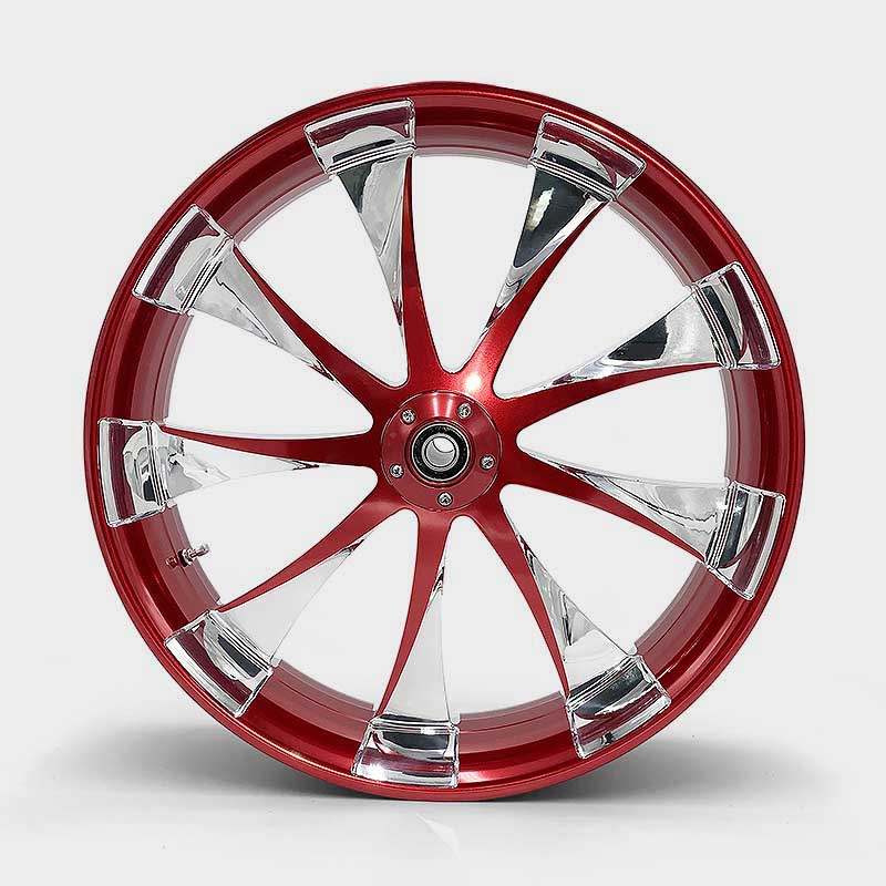 This unique, 9-spoke 3D machined Billet Contrast Cut wheel is available in 16" to 32”- inch diameters and the Newest Fat Tire wheel sizes of 18, 21 & 23 x 5.5-inch sizes, with matching Floating Brake Rotors in 11.5,11.8,13 and 18-inch sizes, with a matching Pulley or Sprocket.