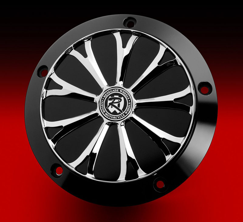 The Renegade Derby Cover is a stunning two piece engineered design. This allows our customers to choose the perfect combination of finishes to complete their bike with. The Derby Base Plate and the Derby Cover are machined from T6061 aircraft aluminum by craftsmen here in the USA. Both the base & cover come in show chrome or black anodized phantom cut and of course we offer cover designs to match all our Renegade or HHI wheel designs.