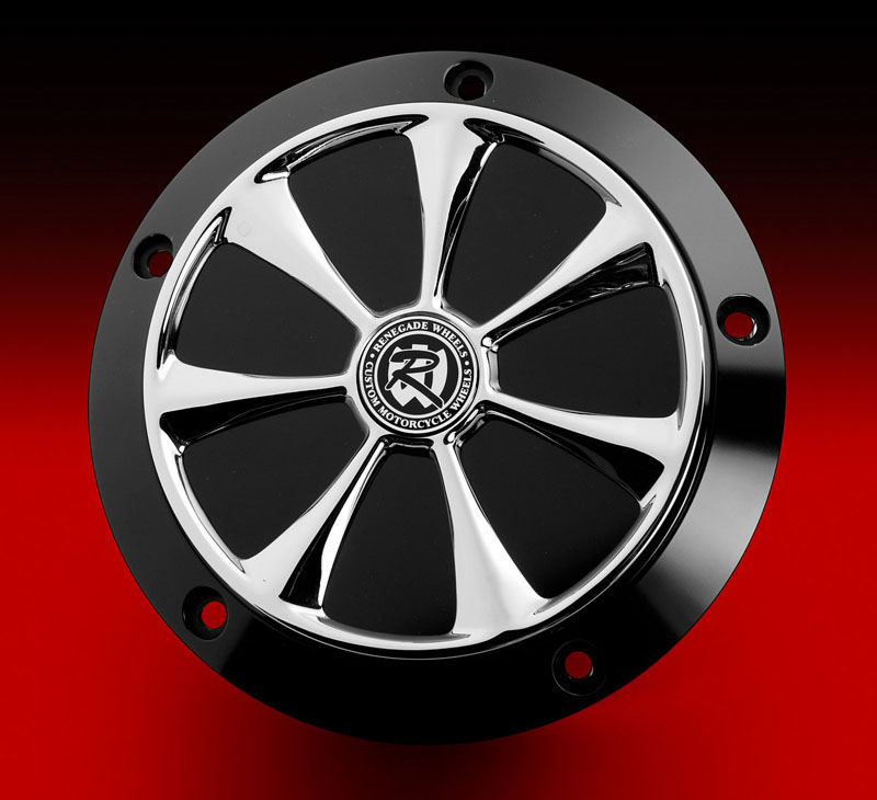 The Renegade Derby Cover is a stunning two piece engineered design. This allows our customers to choose the perfect combination of finishes to complete their bike with. The Derby Base Plate and the Derby Cover are machined from T6061 aircraft aluminum by craftsmen here in the USA. Both the base & cover come in show chrome or black anodized phantom cut and of course we offer cover designs to match all our Renegade or HHI wheel designs.
