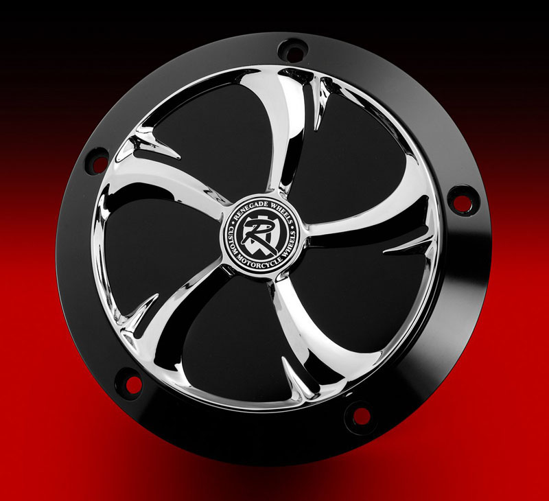 The Renegade Derby Cover is a stunning two piece engineered design. This allows our customers to choose the perfect combination of finishes to complete their bike with. The Derby Base Plate and the Derby Cover are machined from T6061 aircraft aluminum by craftsmen here in the USA. Both the base & cover come in show chrome or black anodized phantom cut and of course we offer cover designs to match all our Renegade or HHI wheel designs.