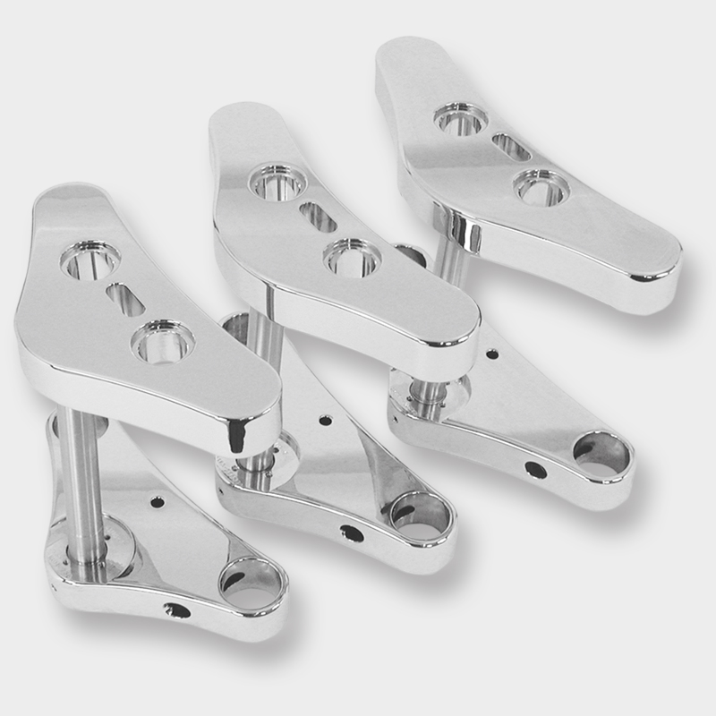 HHI offers an industry leading triple tree product line, precision CNC made in our plant and treated to a show quality finish. Our triple trees have a smooth top design hiding the fork tube and neck stem bolts for a true custom look. Our design utilizes hidden clamp bushings in the lower tree and a double ended insert threaded into the top of each fork tube to provide a clean, positive method of assembly. With generous corner rounding, large radius leading edges, no ball mills or logo's, our triple trees have the best look and at 1 1/2" thick give you the strength needed to provide lasting performance.