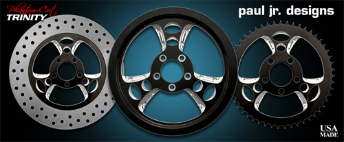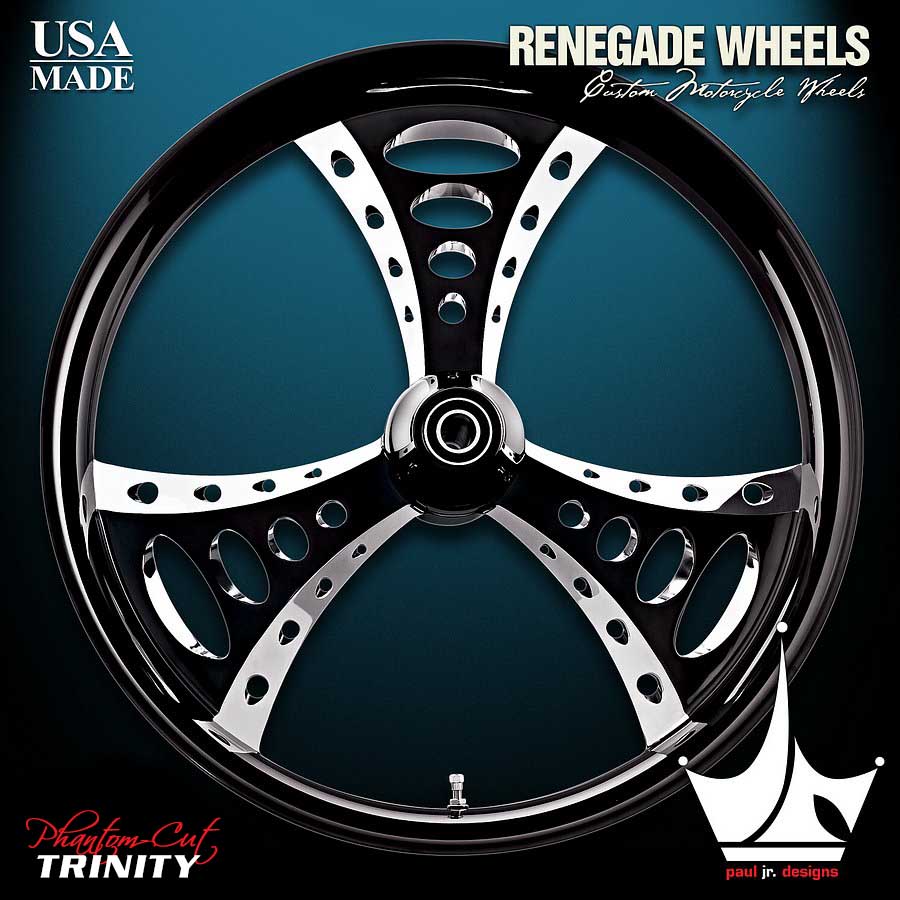 Our partnership with Renegade Wheels has allowed me to take each of my wheel designs from an idea to production. These new wheels give people the opportunity to incorporate one of my designs into their own motorcycle. Trinity Phantom-Cut also available in chrome Twice cut, twice the look… black anodized with raw cuts to give that edgy look. The Phantom-Cut wheels are back with a new twist. They are cut, polished, anodized to a slick ultra black finish. We then re-cut the wheel accents one more time and hand polish them to achieve the high luster that contrasts the ultra black finish.