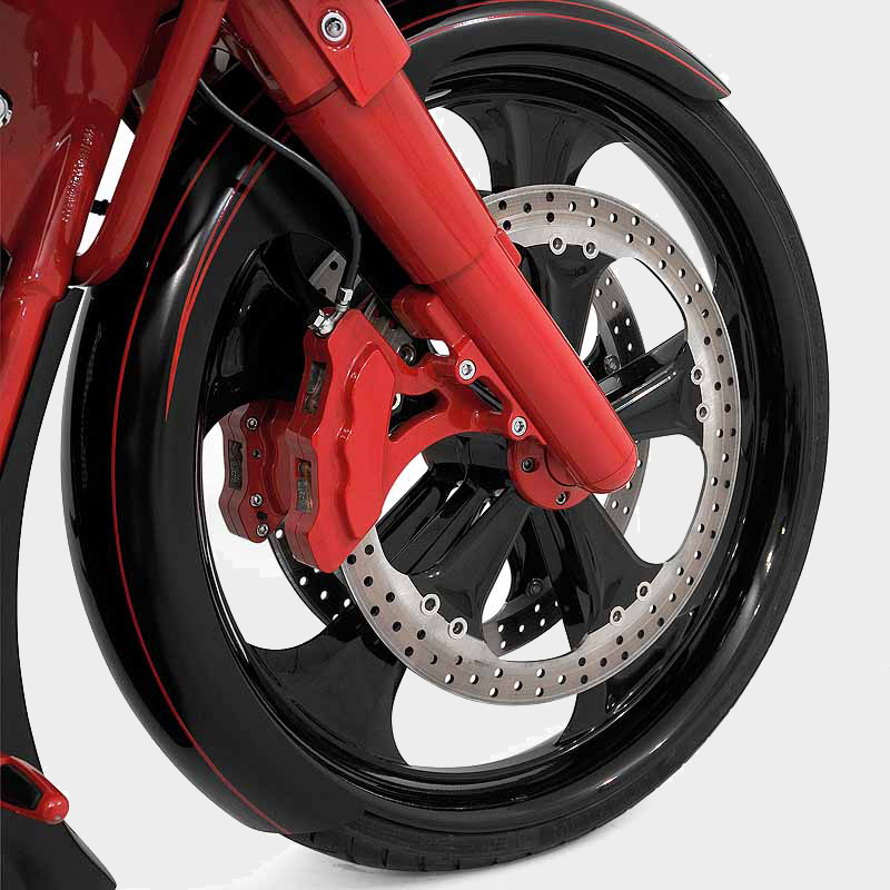 This Wide Tire Package can be ordered as a base kit with the special HHI Wide Triple Tree, HHI Hidden Axle for stock lowers, custom 180/200 Steel Wrap Style Fender, HHI Fender mounts, Spacers and all the hardware you need. The base kit can be expanded with the addition of HHI Billet Lower Legs, with HHI Billet Fender mounts, and a wide range of single or dual HHI Billet Brake Caliper upgrades that include 4 or 6 piston differential bore calipers in 11.5, 11.8 and 13inch brake conversion kits with HHI true floating brake rotors.