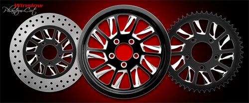 The Winslow Phantom Cut design by HHI/ Renegade Wheels is an 11 spoke edgy contrast cut Forged Billet Aluminum wheel which is a unique and minimalist addition for any bike build. These wheels come in 16 to 32-inch sizes with a matching Floating Brake rotor in 11.5,11.8, 13, & 18-inch sizes with a matching Pulley or Sprocket. Phantom Cut wheels are now available in Black, Aztec Red, Inca Gold and Cobalt Blue.