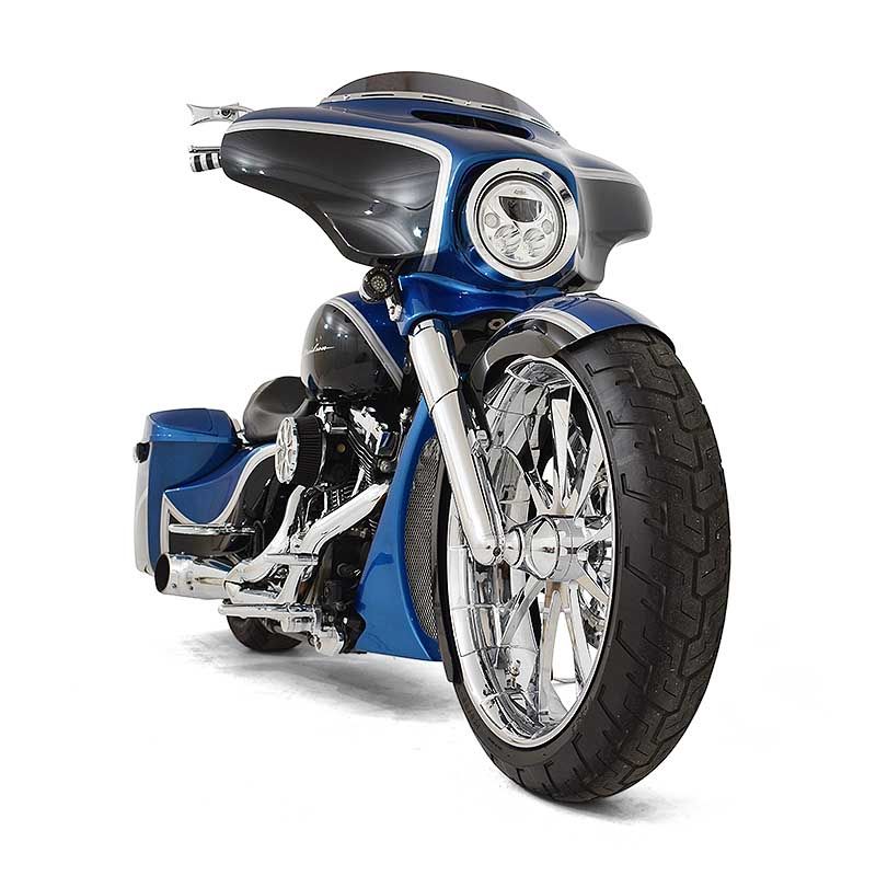 HHI offers a BOLT-ON triple tree kit for a 23"x130mm or 21"x 180mm wheel/tire installation on FL touring model bikes. The design geometry of this triple tree results in a trail measurement similar to stock factory HD specifications and provides a quick and easy, cost effective method of safely installing a 23"x130mm tire or 21" x 180mm Wide Tire Kit and wheel.